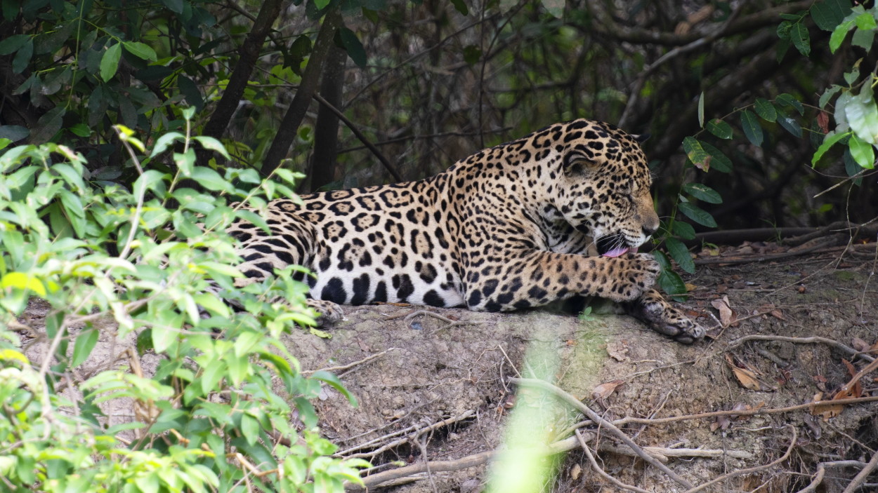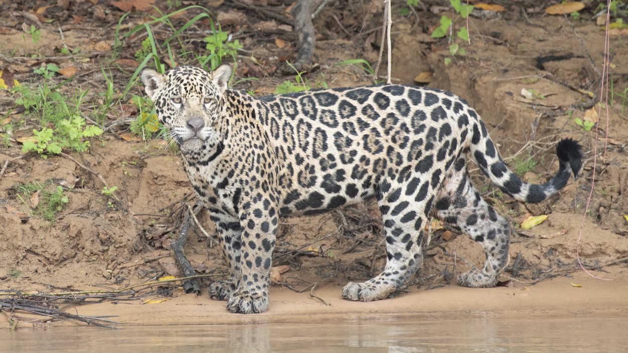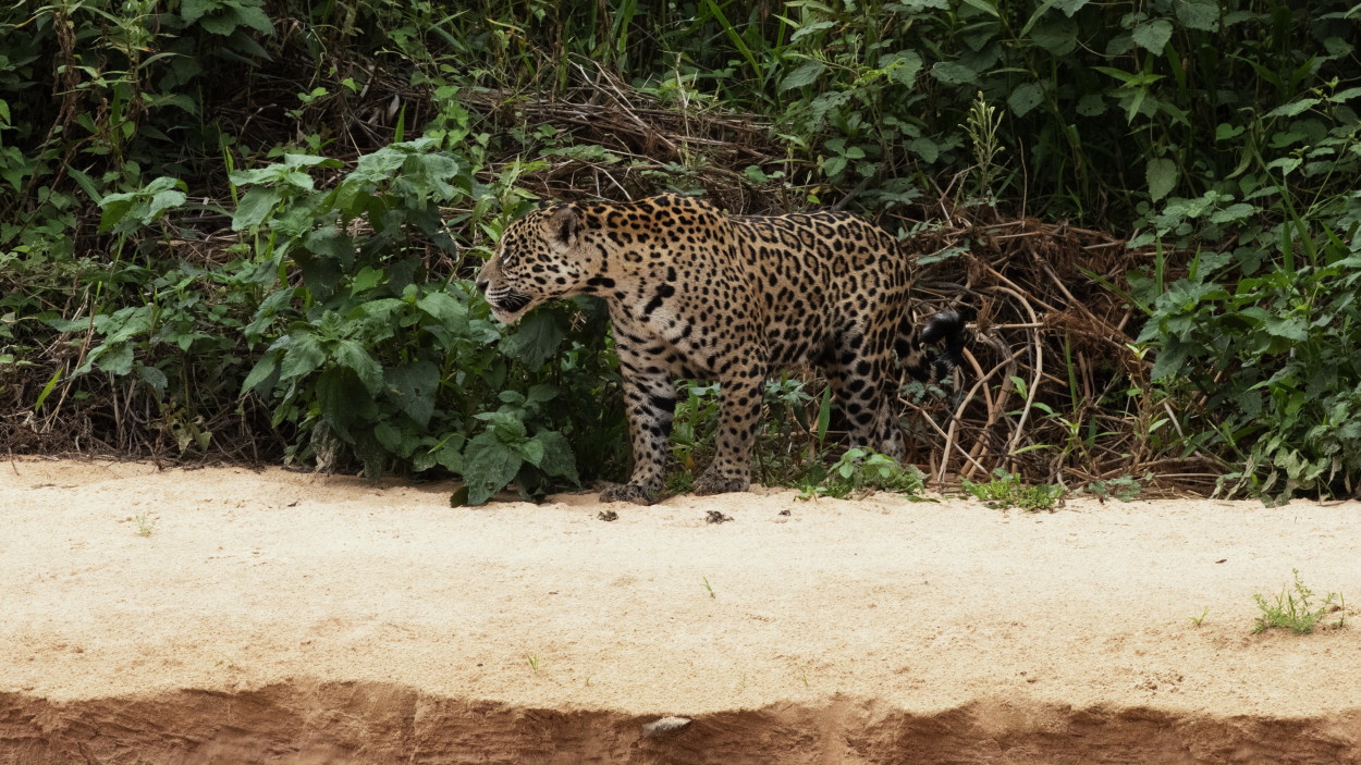 Сейчас полдень, и в это время ягуары часто отдыхают на берегу реки под тенью деревьев. Свернув в одну из тихих заводей, мы неожиданно натолкнулись на крупного самца ягуара, вольготно прогуливающегося вдоль берега в поисках тенистого дерева, единственного спасения от полуденных лучей солнца. По мнению наших рейнджеров, это самый крупный самец этих мест.