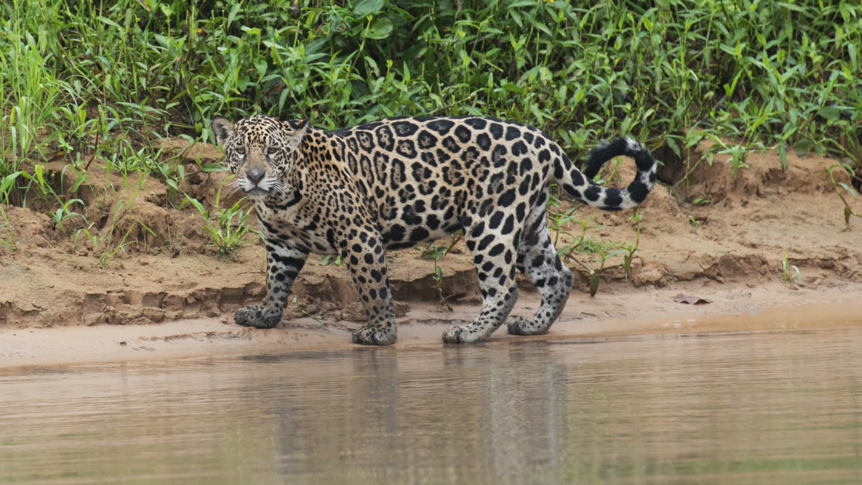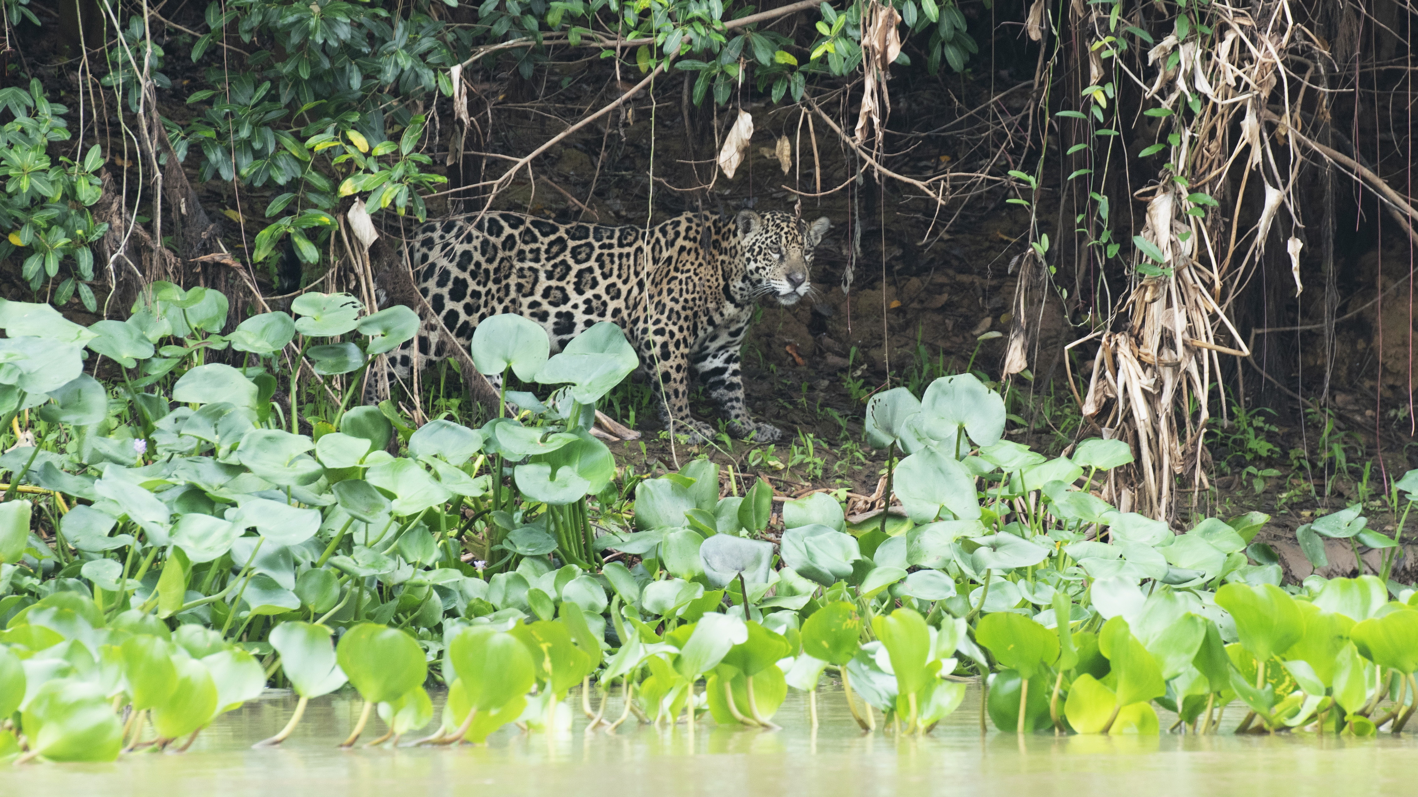 И вот неожиданно из зарослей появляется ягуар. Это молодая самка вышла поохотиться на кайманов.