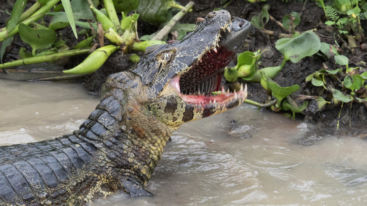На мгновение она замирает, замечая свою любимую добычу, это кайман.