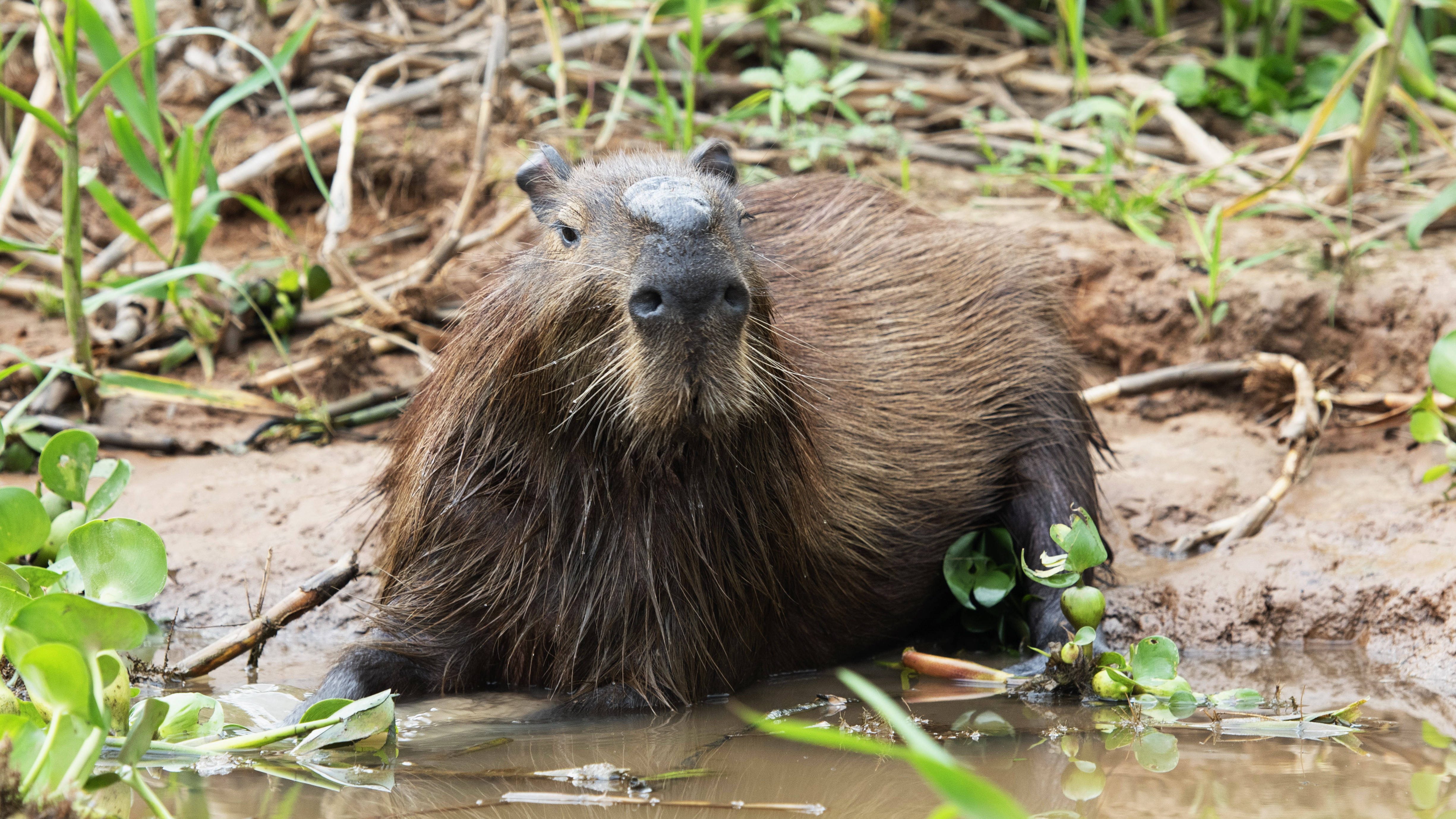 Наконец она замечает семью капибар на берегу реки и быстро прячется в зарослях. Ей очень важно оставаться незамеченной и приблизиться к ним как можно ближе.