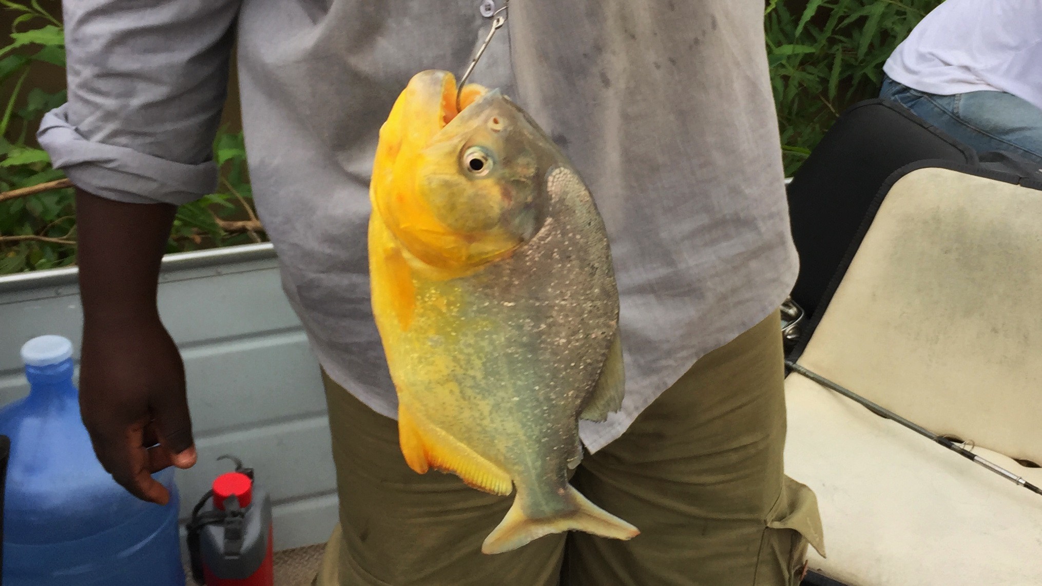 Никто не остался без добычи. Пираньи откусили половину рыбы и разорвали ее под водой, а кайман с трудом осилил вторую половину.